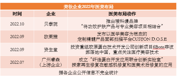 据不完全统计,仅2022年,如欧莱雅、资生堂、贝泰妮已有布局医美方向动作。在今年冲击IPO的企业中,医美赛道是数量最多的企业之一,如已经在A股上市的“医美茅”爱美客6月向港交所重新递交招股书、敷尔佳9月在深交所创业板首发申请过会、巨子生物11月在港交所主板挂牌上市。