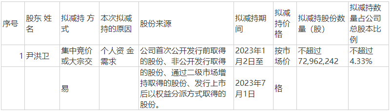 尹洪卫的最新持股比例为公司总股本的22.10%。其计划在2023年1月2日至7月1日期间减持不超过公司7296.22万股公司股份,占总股本比例的4.33%,拟套现金额超过2亿元。