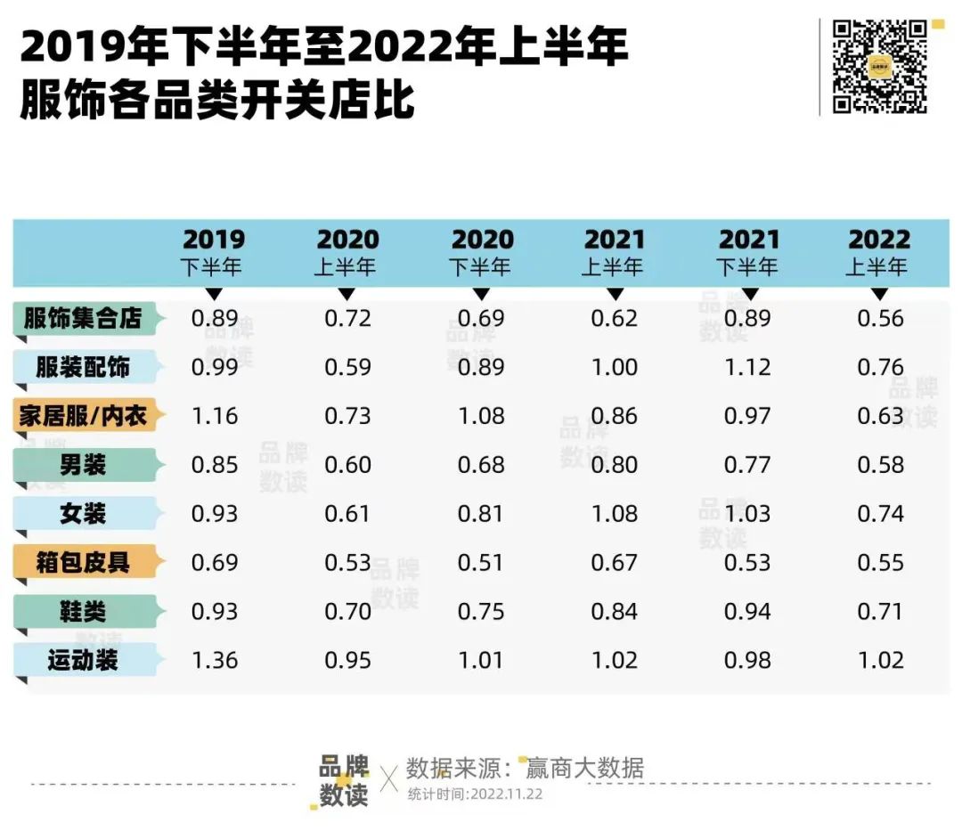 拉长周期来看,2020年上半年初次疫情后,行业各业态开关店比值持续走低,关店规模范围更大,开店更少,服饰行业整体煎熬。但是这样的煎熬从2020年下半年开始缓解,服装配饰、家居服/内衣、男装、女装、鞋类、运动装开关店比有所回暖,再度回到2019年下半年水平已是2年后了。