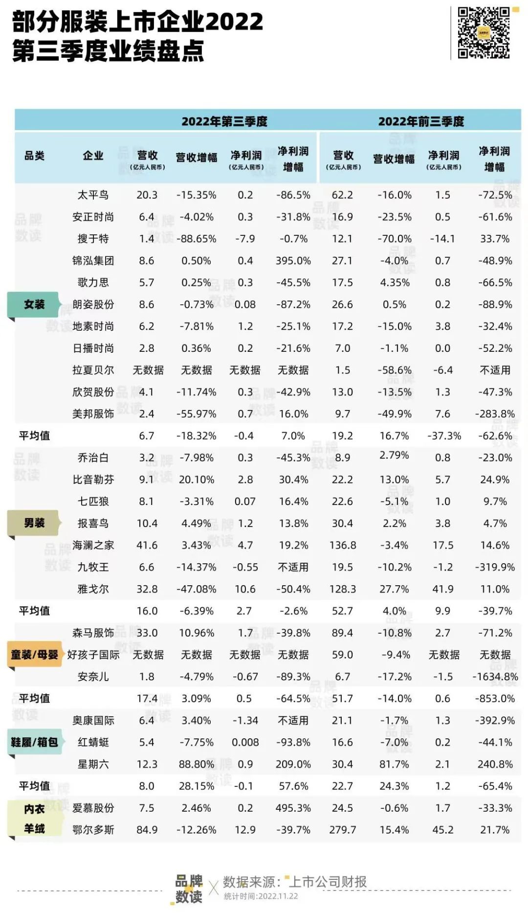 品牌数读总结了26家(港股上市的公司没有正式披露数据,披露了部分数据,本文以文字形式在文章中呈现,未统计到表格中)上市公司第三季度财报数据发现,进入三季度,比音勒芬营收逆势增长了20%,爱慕股份的净利润翻了将近5倍,锦泓集团净利润翻了4倍,星期六翻了2倍,歌力思前三季度营收翻了4倍。细观财报,这些增长与缩减开支、恢复开店等举措有直接关联。而童装品牌安奈儿前三季度的净利润下降了1634.8%。