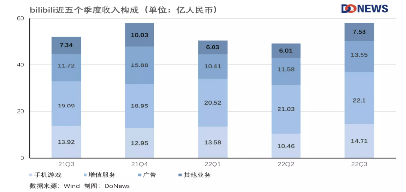 在第三季度财报中可以看出,期内总净收入达到人民币57.9亿元(人民币,下同),比2021年同期增长11%;其中游戏收入为人民币14.7亿元,同比增长只有6%,虽依旧占B站Q3季度营收的25%,但是增长还需进一步提速。