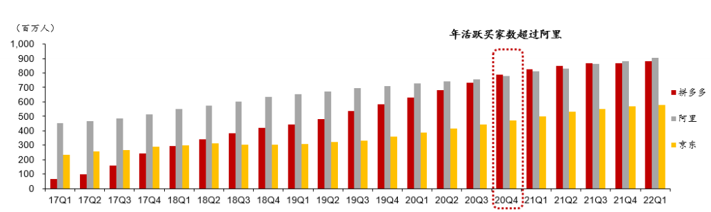 但值得一提的是,2015年4月,拼多多正式上线。短短几年,拼多多就已发展成为国内前三大电商平台。2020年四季度,拼多多年活跃买家数达7.88亿人,首次超过阿里。