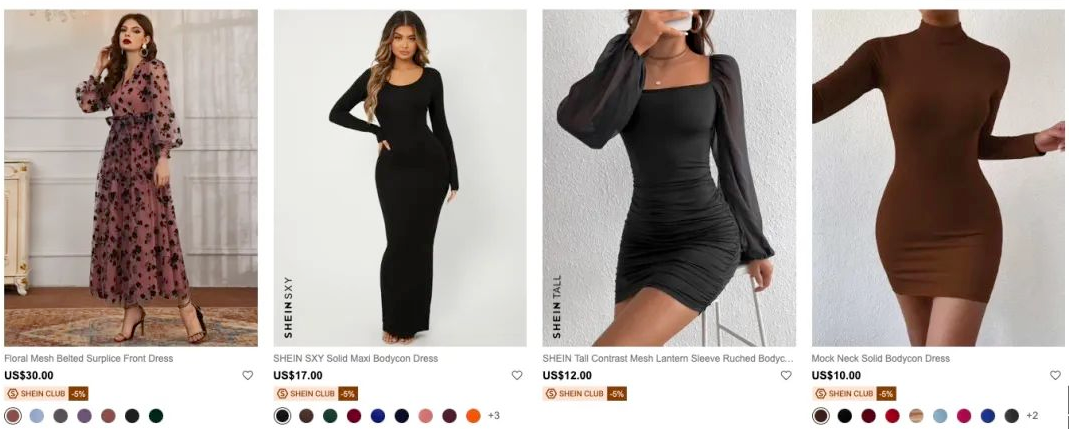 就连主打低价的SHEIN,在不考虑款式的情况下,价格也不是Temu的对手。在SHEIN上,一条连衣裙价格普遍在2位数以上,但Temu只要个位数。
