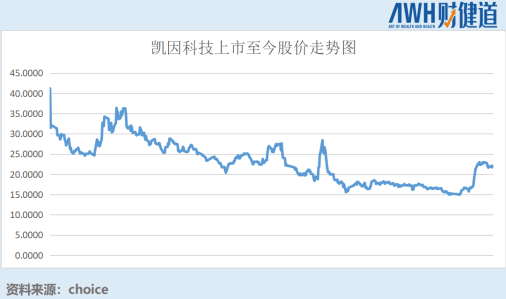 截至2022年11月30日收盘,凯因科技股价仅为21.80元,总市值不到40亿。