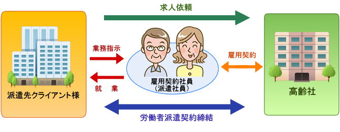 老年再就业者与高龄社达成雇佣契约,高龄社可根据客户个人情况,向各企业介绍劳动力,日常工作的指示和命令由派遣地负责人接受;各企业也可根据公司需求,向高龄社咨询,高龄社会找到符合企业人力资源需求的老年人才。