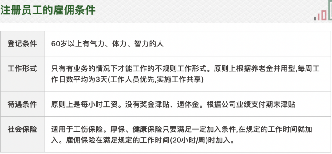 (2)高龄社会详细询问客户的工作条件,例如工作偏好、工作经验、资格和专业技能,注册过程不产生任何收费。根据高龄社官网资料,注册员工的雇佣条件分别在年龄(60岁以上)、身体状态、弹性工作要求、薪资待遇(每小时工资+KPI津贴),参与社保规则上都做出了一定规定。