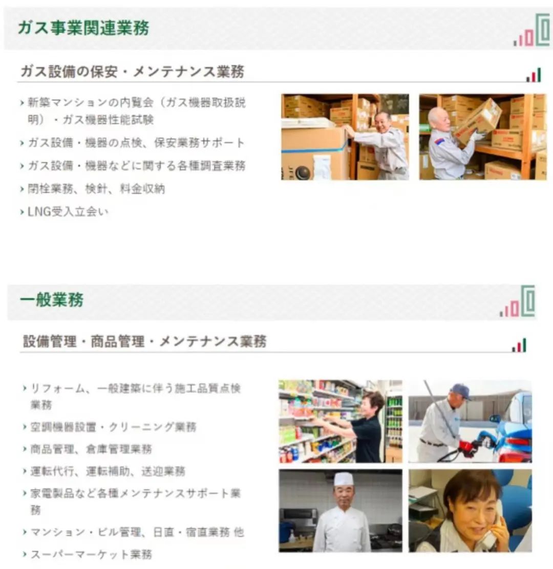 在输送人才的类型上看,主要为燃气行业、服务行业、办公室办公相关职位。因为公司最初成立时的定位是燃气行业,保留了许多燃气相关就职培训与派遣,例如燃气设备的安全与维护、设备安装、器具销售及服务业务等,服务行业内容包括建筑质量检查工作、空调设备的安装和清洗、商品管理、仓库管理代驾、驾驶辅助、接送服务、家电维修、公寓管理、超市业务等,还有办公室文职工作等。