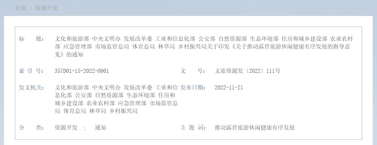 11月下旬,文化和旅游部、公安部、自然资源部、住房和城乡建设部、应急管理部、林草局等十四部委联合印发了《关于推动露营旅游休闲健康有序发展的指导意见》。对此,安徽途居露营地投资管理股份有限公司总经理助理靳晓峰(早在2010年就开始涉猎露营)激动地告诉新旅界(LvJieMedia),“《意见》出台,毫无疑问是给从业者吃了颗定心丸,打了针速效药。”