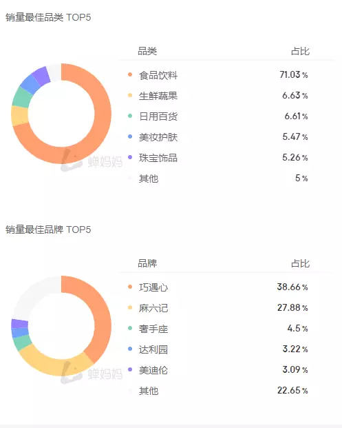 不过,让张兰欣慰的是,麻六记的酸辣粉和小肥肠等食品还是非常火,抖音电商排行榜显示,麻六记螺蛳酸辣粉以909万元的销售额,登上抖音近30天的螺蛳粉爆款榜榜首。该榜单第二名为李子柒的原味酸辣粉产品,30天内平台销售额885万元。 从直播间数据来看,张兰的主要带货品类已经从珠宝饰品,转变为食品饮料和生鲜蔬果类。