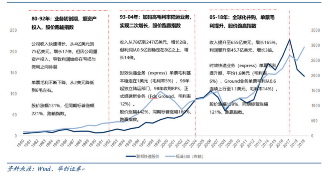 比如在1998年,联邦快递以23亿美元收购Caliber System,获得其在北美陆运快递的网络,后来发展成联邦快递Ground。如今Ground销售额超过140亿美元,创造的利润占到整个联邦快递的近半,行业地位仅次于UPS。