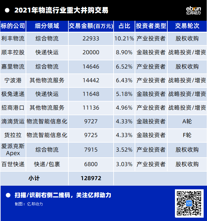 比如2021年,极兔收购百世快递、顺丰收购嘉里物流、德迅收购爱派克斯、马士基集团收购利丰物流等,都是领先的物流企业加强融资和投资步伐,筹措资金积极扩张版图,整合优化物流全产业链关键资源。