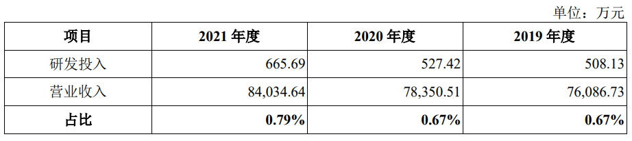 招股书显示,2019年至2021年,拉拉米的研发费用分别为508.13万元、527.42万元和665.69万元,占营业收入的比重分别为0.67%、0.67%和0.79%;而同期行业平均研发费用率分别为1.69%、1.72%、1.67%,公司研发费用率不足行业平均水平的一半。拉拉米的研发费用较低。