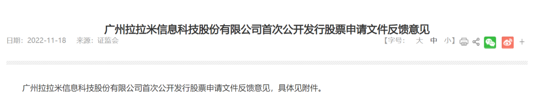 11月18日,中国证监会官网公布广州拉拉米信息科技股份有限公司(下称拉拉米)首次公开发行股票申请文件反馈意见,反馈意见主要包括规范性问题、信息披露问题、与财务会计资料相关的问题及其他问题等共计29个问题。