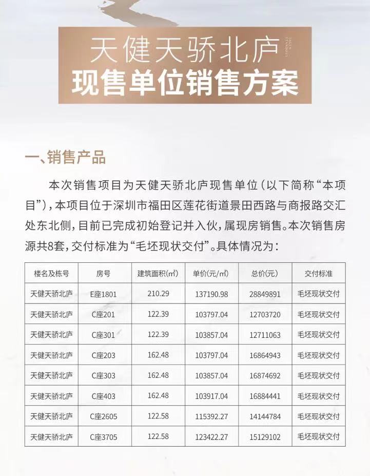 据“深圳房地产信息网”消息,11月30日,天健天骄北庐发布销售方案,8套现房将进行销售,面积段主要为122.39-210.29平方米的产品,均为毛坯现状交付。