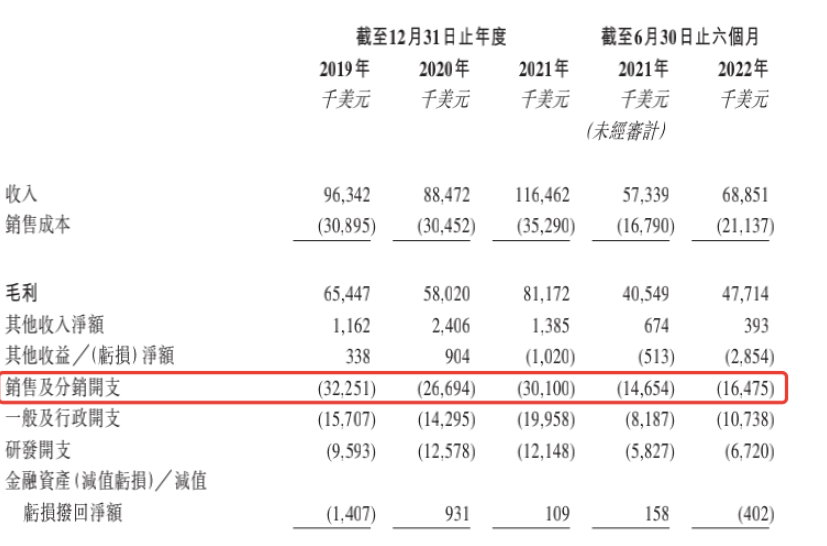 在业聚医疗的各项费用中,销售费用占比最高。2019年至2021年,公司销售费用分别为3225万美元、2669万美元、3010万美元,销售费用率分别为33.5%、30.2%、25.8%。2022年上半年,业聚医疗销售费用为1647万美元,销售费用率降至23.9%。