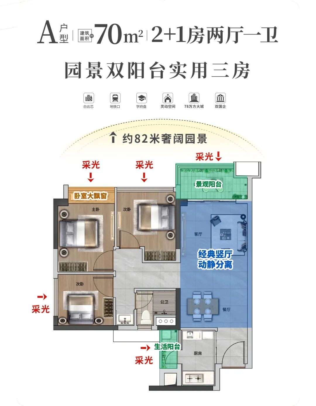 70平三房户型,适合预算有限的买家,不仅总价低,实用性还十分高。市面上70平普遍只做两房,项目却做到了三房,相当于同等面积多得一间房,十分划算。