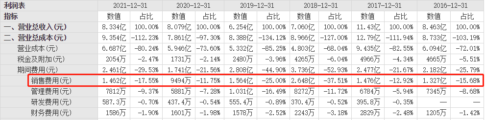 即使如此,目前海南椰岛依旧保持着较高的销售费用。其中最低的2020年也有9500万,而在2018年,单是列支的广告费就有1.25亿元。