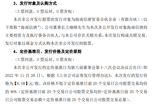 根据海南椰岛对外披露定增预案,海南椰岛拟以8.08元/股的价格,向公司董事长王晓晴控制的海南信唐贸易合伙企业(有限合伙)(简称海南信唐)发行股票募资不超过6.54亿元,扣除发行费用后将全部用于偿还银行借款与补充流动资金。