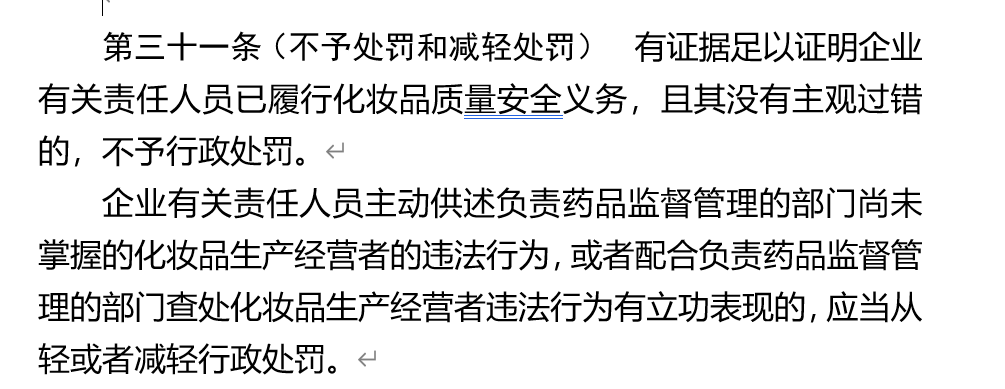 如今,意见稿对“不予处罚和减轻处罚”做了规定,即,有证据证明企业有关责任人员已履行化妆品质量安全义务,且其没有主观过错的,不予行政处罚;若企业有关责任人员主动供述或者配合监管层查处违法行为,有立功表现的,应当从轻或者减轻行政处罚。