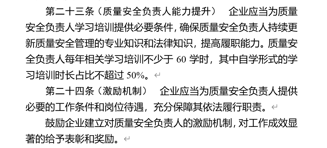 值得一提的是,意见稿明确指出,企业应当为质量安全负责人提供必要的工作条件和岗位待遇,“鼓励企业建立对质量安全负责人的激励机制,对工作成效显著的给予表彰和奖励”。此外,企业应当为质量安全负责人学习培训提供必要条件,“质量安全负责人每年相关学习培训不少于60学时,其中自学形式的学习培训时长占比不超过50%”。