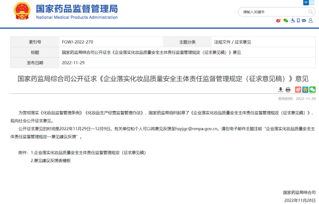 日前(11月29日),国家药监局综合司发布了关于公开征求《企业落实化妆品质量安全主体责任监督管理规定(征求意见稿)》(以下简称意见稿)意见的通知。意见稿对化妆品责任主体、质量安全关键岗位的职责与义务,以及免予行政处罚的情况,分别做了明确说明,公开征求意见的时间截至12月9日。