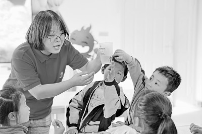 在重庆彭水苗族土家族自治县“安全科普空间”里,老师为孩子们演示感温贴加入热水后变色。资料图片