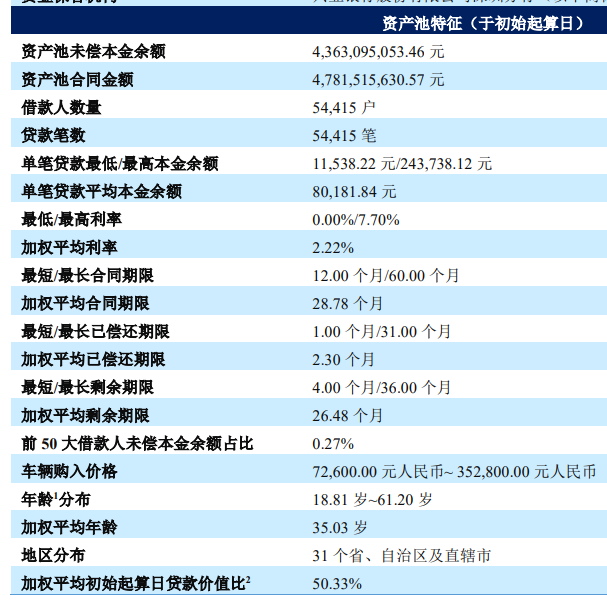 截至2022年6月末,比亚迪零售贷款未偿本金余额为367.55 亿元,其中新能源贷款未偿本金余额为323.30亿元,占比达88%;零售贷款与新能源贷款的不良率分别为0.16%和0.14%。本次入池产品主要包括新易贴息贷、自由随心贴息贷、简易贷、新能源专享贷等金融产品。