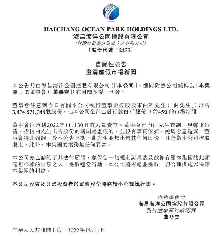 海昌海洋公园12月1日晚间在港交所公告,董事会注意到今日有关公司执行董事兼控股股东曲程出售3,474,571,048股股份,占公司全部已发行股份约45%的市场新闻。