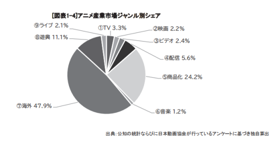 而且,从日本动画产业整体市场来看,商品化占比达24.2%,仅次于海外收入占比。