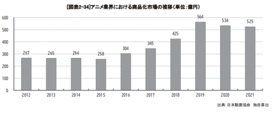 从狭义的动画市场来看,也就是动画业界(指动画制作企业的销售额,包括广告、活动等等IP授权收入)的商品化市场,其实持续受到疫情影响,同比小幅下降1.7%,为525亿日元。