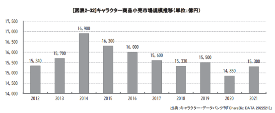 如果看CharaBizDATA2022(21)调查数据,2021年日本卡通商品整体零售市场规模达15300亿日元,同比增长3%,逐渐从疫情打击中恢复。