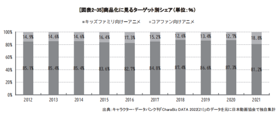 2021年日本动画商品化市场中,儿童家庭向商品占到总市场份额的八成,自2012年以来,这一比例从未变过,而面向核心粉丝的市场份额在2021年达到了18.8%,刷新历史最高记录。