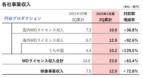 具体来看收入数据,今年二、三季度,圆谷的日本国内商品销售和许可证收入达10亿日元,同比增加36.8%,主要受热门电影《新·奥特曼》上映带动商品销售;
