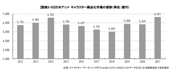 从广义的动画市场(包括流通在内的动画产业整体销售额)来看,2021年日本动画角色商品市场规模达6631亿日元,同比大幅增长14%。