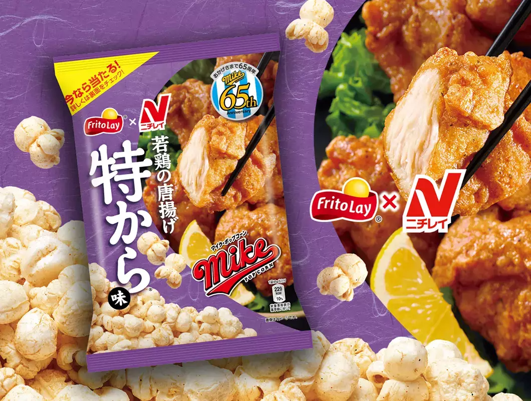 这一次,日本爆米花市场销量第一的mike和日本冷冻炸鸡市场销量第一的日冷「特から 」进行了联名,以秘制酱油调味汁和辛香的炸鸡外皮为原型开发了新品。