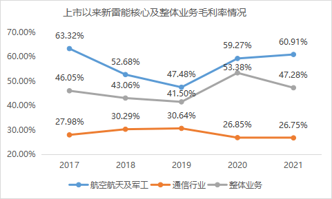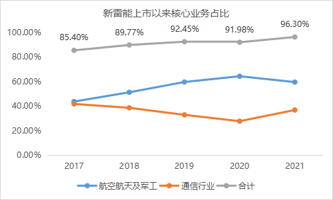新雷能近些年来的主营业务几乎全部聚焦于航天航空军工和通信这两大核心业务板块上,2017年占比85.40%,2021年更是高达96.30%。并且随着形势的变化,新雷能不断调整两大业务的配比,实现“进可攻,退可守”的业务配置平衡。