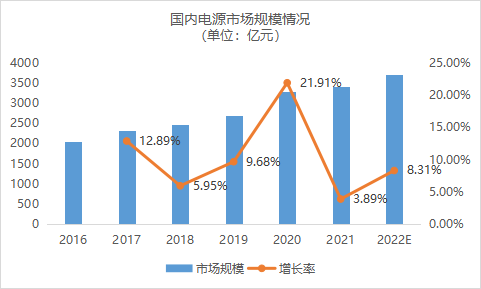 随着近年来“双碳”政策的推行,锂电、光伏、风能等新能源已成为未来大趋势,作为新能源不可缺少的配套——电源设备也进入快速发展期。同时,电源设备在5G、航天航空等成熟的传统领域大量应用,积累下较大的市场规模。统计数据显示,国内电源市场规模在近些年来发展较为可观,除了2018年受贸易战影响、2021年受疫情影响以外,基本都保持了10%左右的年增长率,2020年更是达到了21.91%。