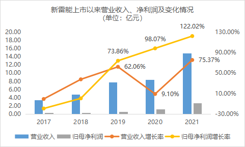 新雷能上市这五年来的业绩非常可观——营收翻了4倍多,归母净利润更是增长至接近8倍。2021年的营收首次超过10亿达到14.78亿元,归母净利润也达到了2.74亿元。