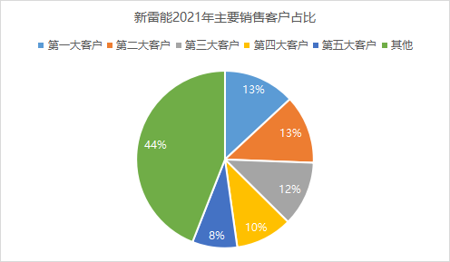 根据新雷能2021年年报披露,前五大客户的销售金额占比分别为13.08%、12.51%、11.83%、10.36%和8.18%,合计占比55.96%,金额达到了8.27亿元,十分集中。