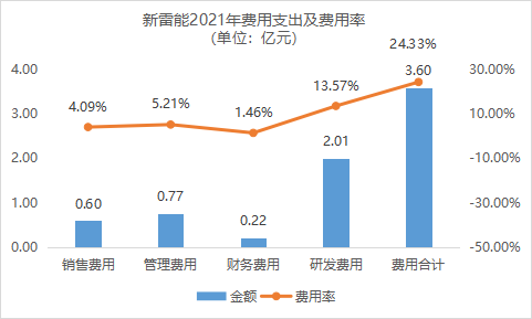 在费用管理方面,新雷能诠释了什么叫“把钱花在了刀刃上”。2021年新雷能一共支出费用3.6亿元,营业期间费用率为24.33%,仅排在行业第十名。其中销售费用、管理费用、财务费用等等加起来共1.59亿元,仅占研发费用的80%。