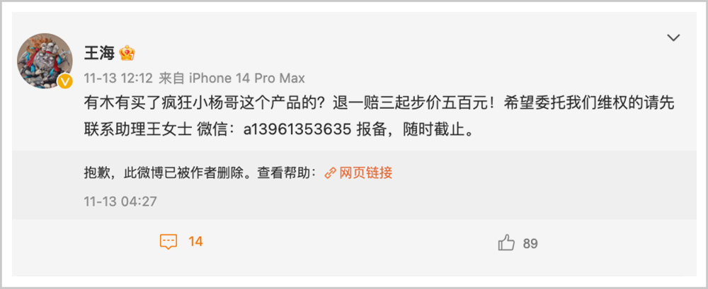 不久前,疯狂小杨哥所属公司花费一亿元在合肥买办公楼冲上了微博热搜。而王海这一次的建议是:再准备一亿元,向消费者退一赔三。