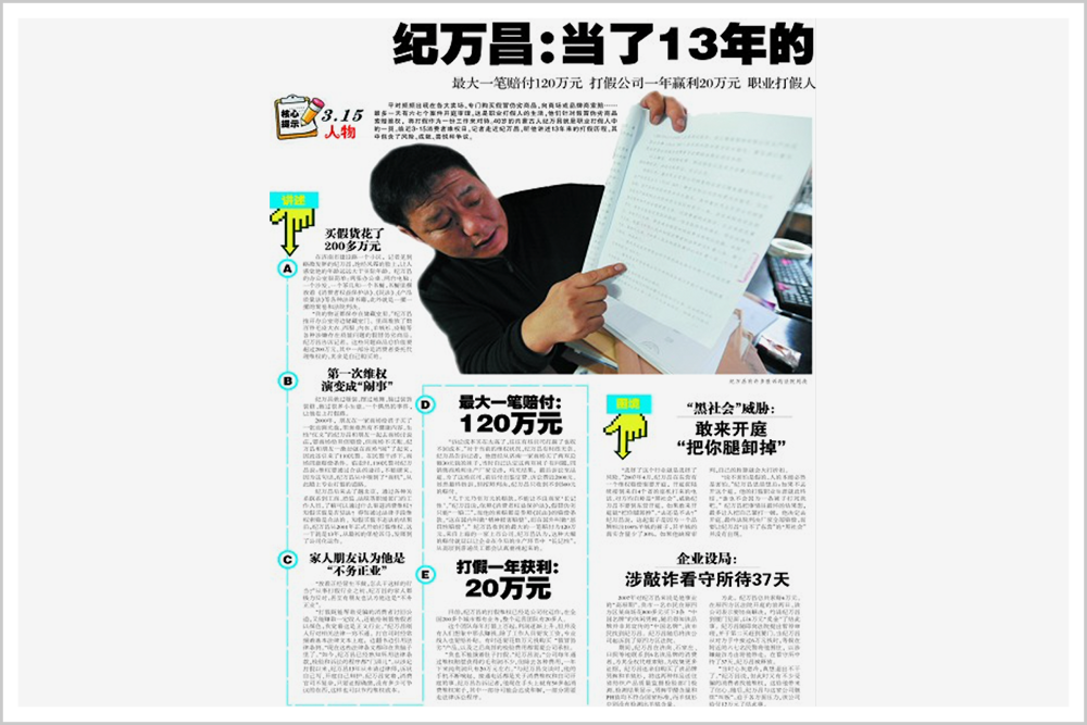 1997年,南方周末写了一篇报道,讲述全国各地18位职业打假人的境遇,文章名字为《个人打假群英会》。