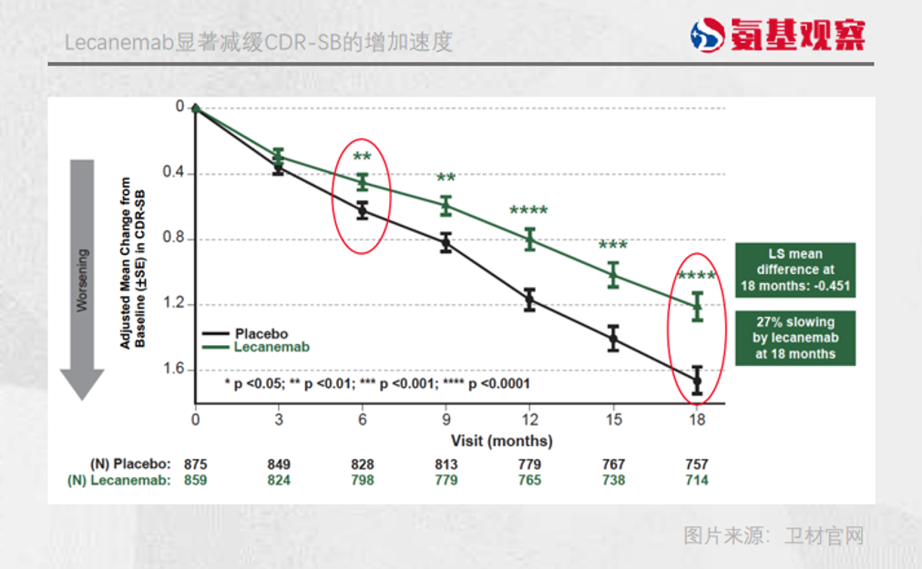 结果显示,Lecanemab成功达到了临床终点。具体来看,lecanemab的临床三期试验,使用的是全球认知和功能量表CDR-SB做为主要终点。