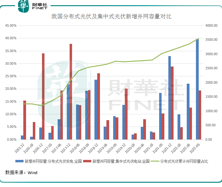 随着装机量的迅速提升,我国分布式光伏的并网容量占比亦快速上升,在2022年三季度接近40%。