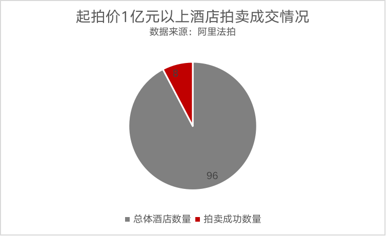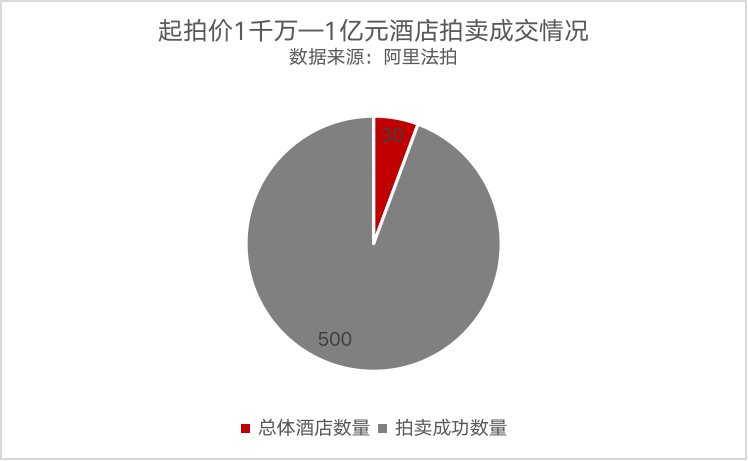 而在价格千万元以上的拍卖酒店中,超过500家酒店中仅有30家酒店的地产或股权、债权资产拍卖成功。单从拍卖数量来看,过去一年中,几乎每天都有酒店“上架”阿里资产拍卖网,但成交率仅不到6%。剩余400多家酒店在拍卖过程中无人报名、无人出价,甚至经过多次降价仍惨遭流拍。