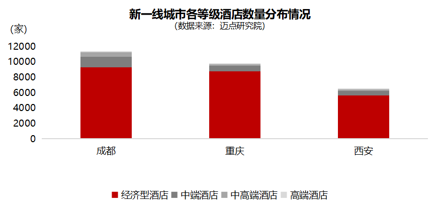 再看成都、重庆、西安为代表的新一线城市。截至2022年12月1日,其在营酒店数量分别为11374家、9728家和6461家,同比2021年,除了成都在营酒店数量下降较少以外,重庆和西安均少了近4000家酒店。