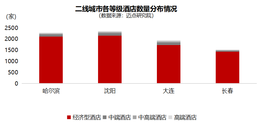最后看哈尔滨、沈阳、大连、长春为代表的二线城市,截至2022年11月30日,其在营酒店数量分别为2264家、2332家、1920家和1507家,与2021年相比,在营酒店数量减少相对较少。