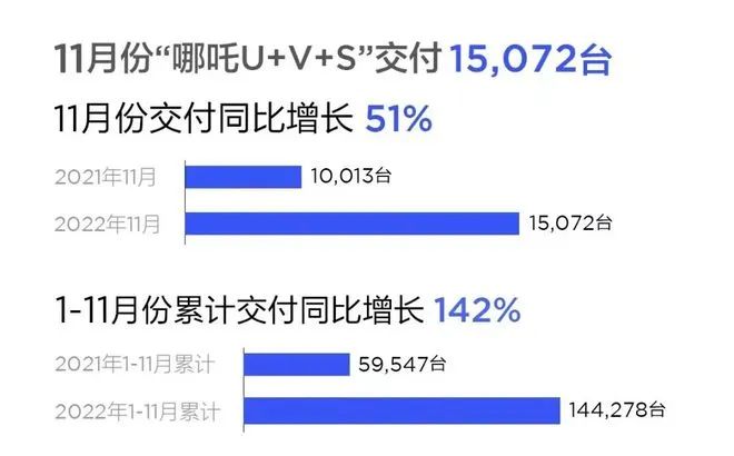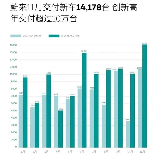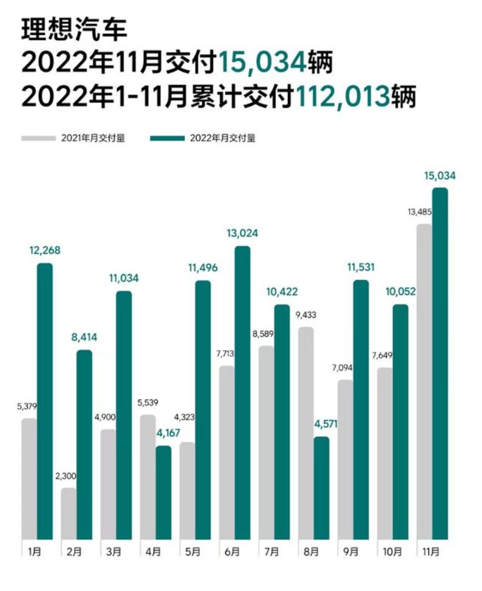 理想汽车紧随哪吒汽车之后,11月共交付新车约1.5万辆,创下单月最高交付纪录,同比增长11.5%。今年1~11月,理想汽车累计交付新车约11.2万辆。截至2022年11月30日,理想汽车累计交付量为23.61万辆。