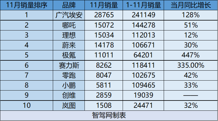 在目前这份榜单中,广汽埃安排名第一,11月共计销售28765台,同比增长91%。全年累计销量达到了241149台,同比增长128%,提前实现全年销量翻倍的目标。
