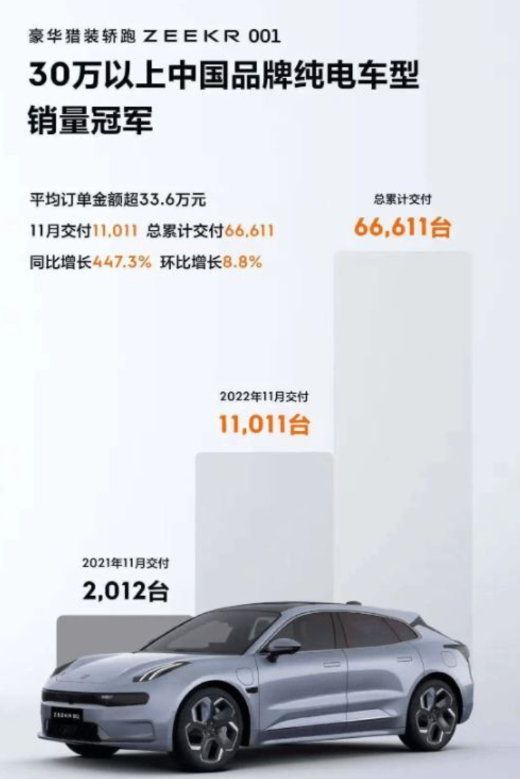 极氪001于11月份交付11011台,同比增长447.3%,环比增长8.8%,月交付量持续破万。